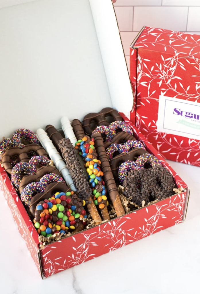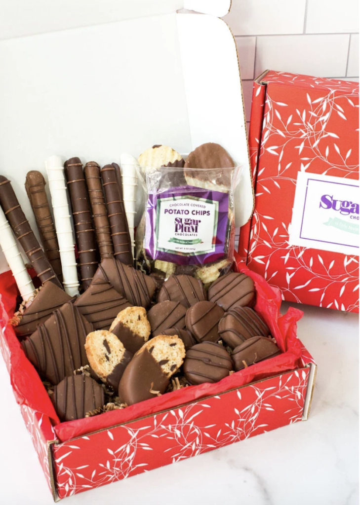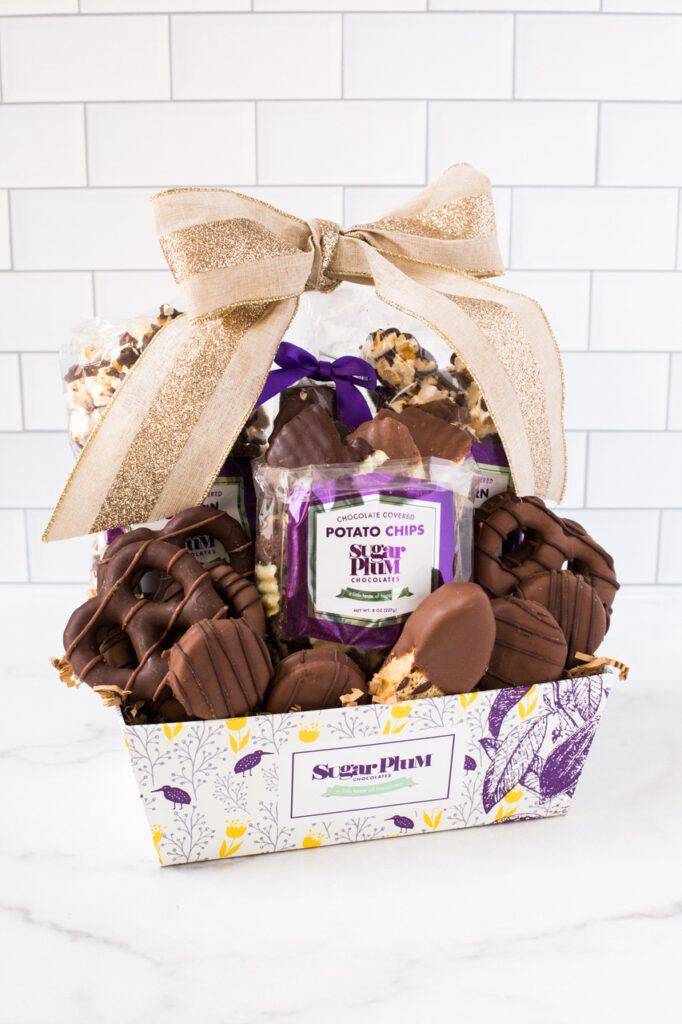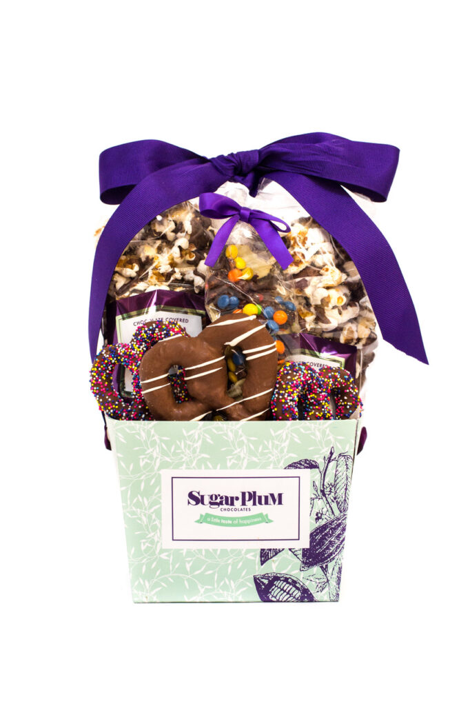 This box is a delicious combination of salty and sweet with a sampling of some of Sugar Plum’s most popular delights. Included are chocolate-covered treats: an assortment of chocolate-dipped potato chips covered with M&Ms, chocolate-dunked pretzels and the famous chocolate-drizzled popcorn.