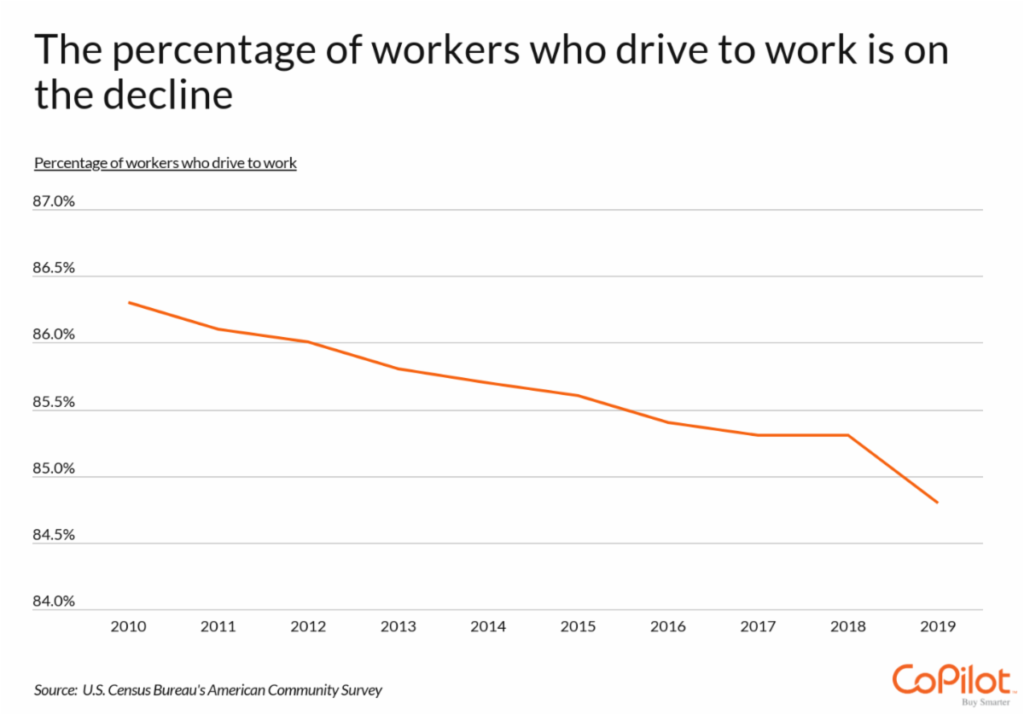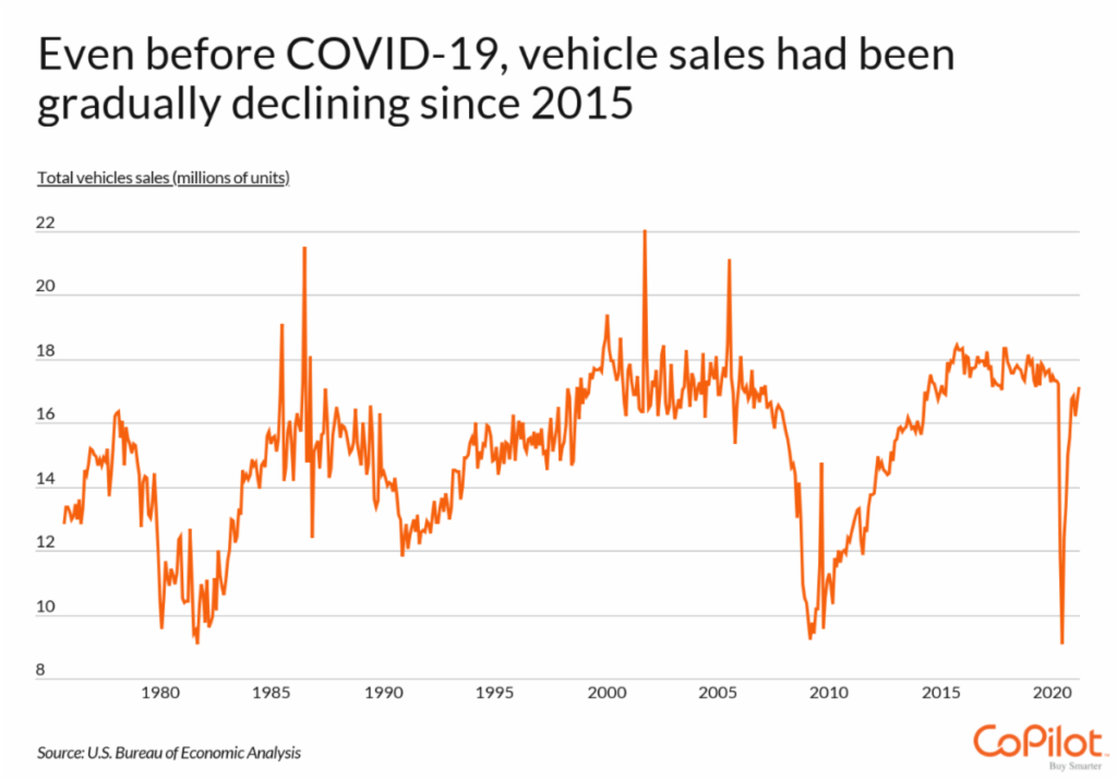 Alongside declining rates of car commuting, vehicle sales in the U.S. have also been trending downwards since around 2016 as Americans drive less. Experts attribute the decline in driving to a variety of factors, including the fact that young people are delaying getting their driver’s licenses and using them less, the increase in working from home, and the rise in online shopping. Even after the pandemic is over, many Americans are likely to continue working from home at least part of the time, which will affect overall car usage and likely future vehicle sales.