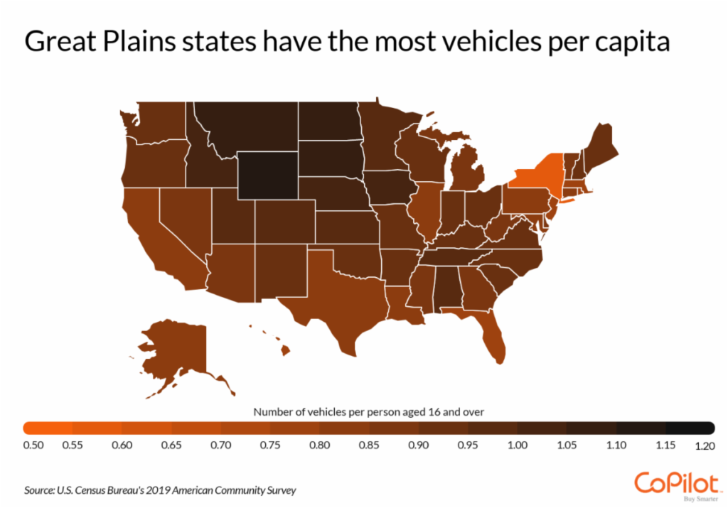 The American car culture is slowly shifting. Vehicle sales have been declining for years, and fewer workers are commuting by car. More recently, the onset of the COVID-19 pandemic caused auto sales to crash temporarily. But even as the industry has rebounded, the long-term effects on the auto industry remain uncertain. With millions of Americans working from home, fewer people are commuting, but fewer people also want to take public transportation. According to the most recent data from the Census Bureau, there are 0.85 passenger vehicles per person aged 16 and over (slightly less than one vehicle per person), but in certain car-dependent areas, this number remains higher.
