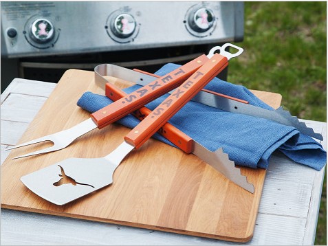 For any superfan who likes to grill, this sports team grill set shows off team pride. The Classic 3-Piece BBQ Set includes a heavy-duty spatula, grill fork (both with built-in bottle openers), and tongs. Made from stainless steel and hard maple wood, each bears a bold, laser-etched logo. Pick your favorite from every major-league sports team, over 140 college teams, or any branch of the military, $49.95 on www.thegrommet.com