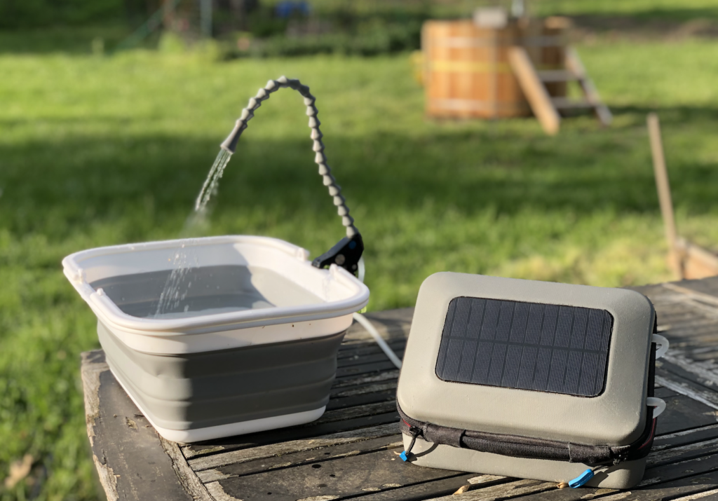 The GoSun Flow is small enough to fit into a backpack, uses solar energy to filter 99.99% of pathogens from water (including viruses such as COVID), and can function as a portable handwashing station, warm shower, source of clean drinking water, and much more.