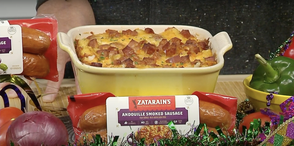 Chef Belton recommends starting the day off with food that will be nourishing and satisfying. One versatile food that will get you feeling ready for the day is the smoked sausage from Zatarains! With flavors such as Cajun Style, Andouille, and Blackened Seasoned Chicken, feel free to throw these sausages into a breakfast casserole to get you feeling Mardi Gras ready!