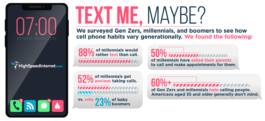 - 52% of millennials say they feel anxious taking a phone call, versus only 23% of boomers.