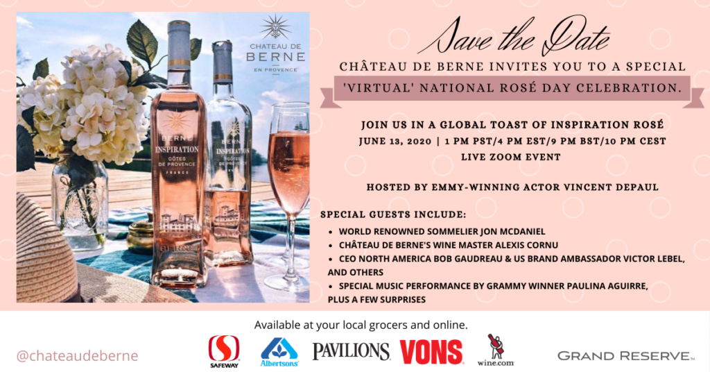 Scheduled for Saturday, June 13, 2020 at 1 PM Pacific Standard Time (4 PM EST/9 PM BST/10 PM CEST), the online ZOOM event will be hosted by Emmy-winning actor Vincent DePaul with special guests, including world renowned sommelier Jon McDaniel, Château de Berne’s Wine Master Alexis Cornu, CEO North America Bob Gaudreau and US Brand Ambassador Victor Lebel, and others. Grammy winner Paulina Aguirre will give a special music performance, with other special surprises planned.