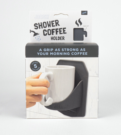 The Joeski Shower Coffee Holder has a grip as strong as your morning coffee. It can hold up to five pounds with its patented grip technology, without using risky suction cups or messy adhesives. The Joeski holds most mug shapes and sizes up to 20 ounces.