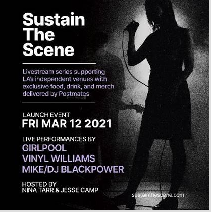 Sustain The Scene will reopen music and nightlife venues throughout Los Angeles first, beginning March 12, 2021, including exclusive new food & beverage menus, cocktail packages, custom co-branded merch and gift cards, that can later be redeemed for concert tickets, all available to order through Postmates.