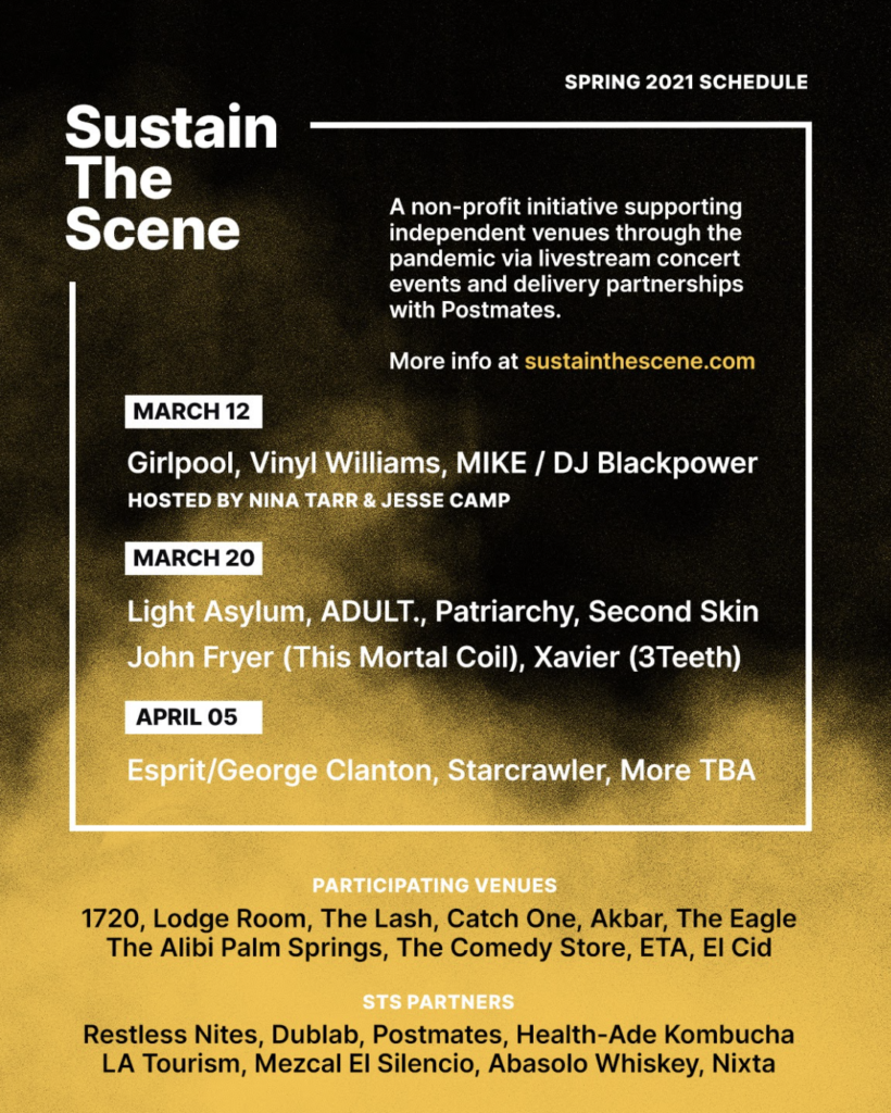 Sustain The Scene’s livestream concerts will feature world-class performances, celebrity cameos, comedians and guest hosts, taped from the very iconic music stages that helped make them. The virtual concerts will take place on select Fridays and Saturdays and kick off March 12, 2021 with Girlpool and Vinyl Williams.